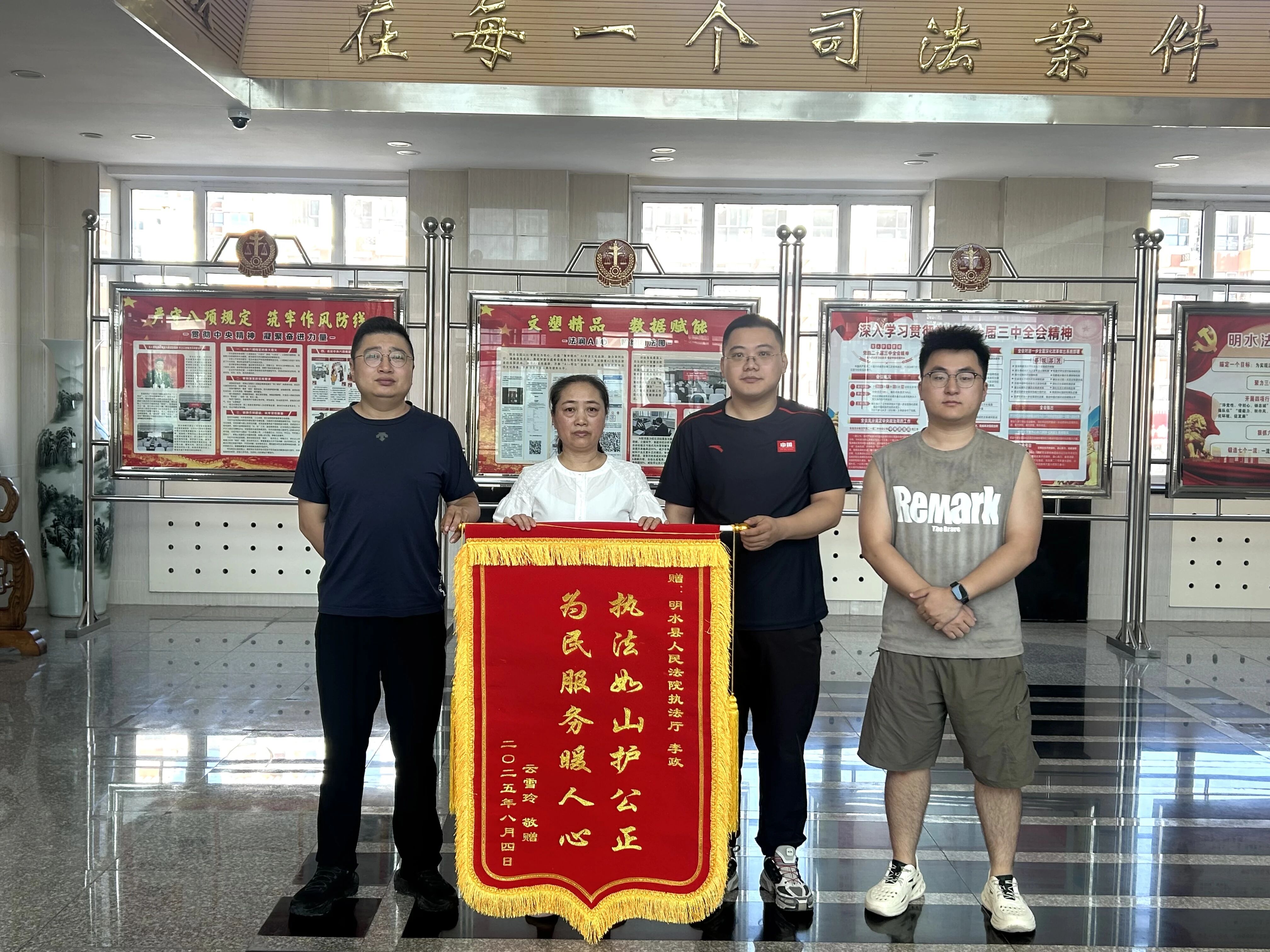 “法官,太感谢了!真没想到,这笔钱都拖欠十多年了,你们这么快就帮我要回来了!”近日,申请执行人云某激动地将一面印有“执法如山护公正,为民服务暖人心”的锦旗送到明水法院执行法官李政手中。锦旗上烫金的大字在阳光下熠熠生辉,不仅承载着当事人的深深谢意,更是对明水法院执行干警锲而不舍、攻坚克难精神的生动诠释。
